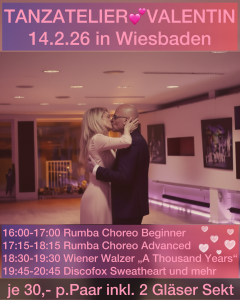 Bei speziellen Anlässen und Tanzrichtungen kannst du an einem Termin deinen Wunschtanz erlernen oder festigen und dir und deinem Lieblingsmenschen eine besondere Zeit schenken.